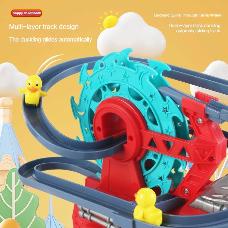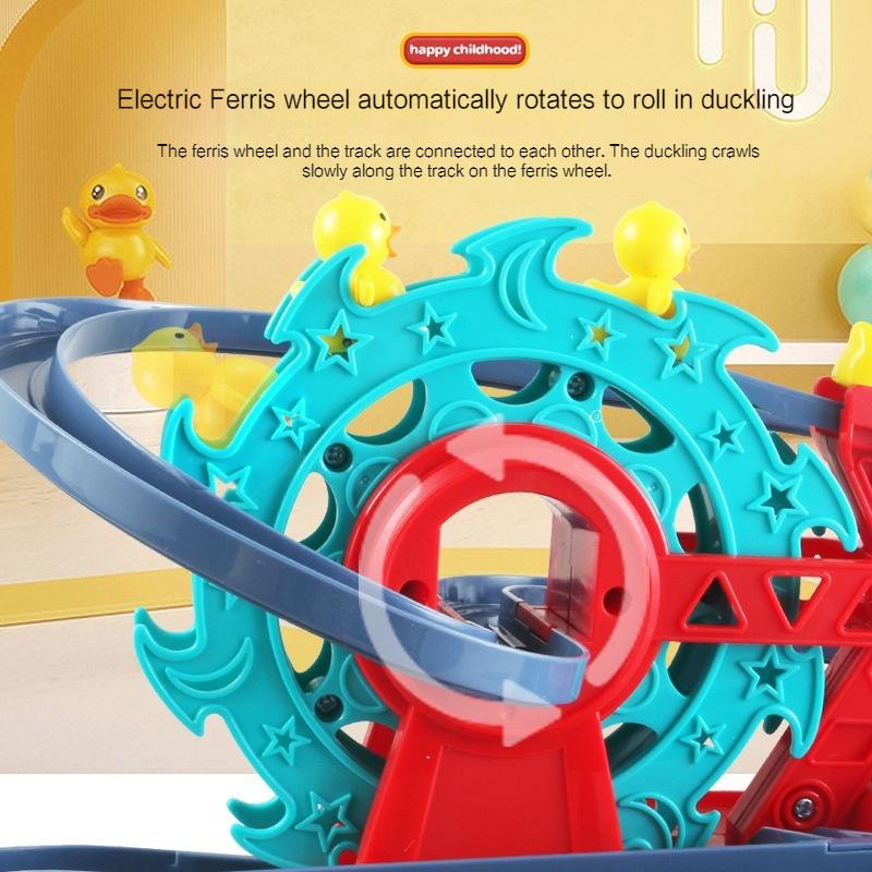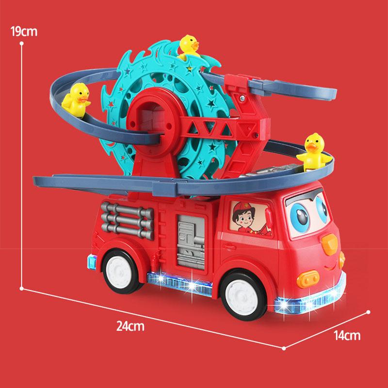 لعبة سيارة إطفاء بتصميم طفولي جذاب، يعلوها مضمار متعرج ومسار انزلاقي متكامل. تأتي اللعبة مزودة بمجموعة من الصيصان الصغيرة اللطيفة التي تتحرك ميكانيكياً عبر عجلة دوارة (Ferris Wheel) لترتفع إلى أعلى المضمار ثم تنزلق بسرعة في مسار ممتع ومتكرر. تتميز اللعبة بمؤثرات إضاءة جذابة وتعمل بالبطاريات لتوفر حركة تلقائية لا تتوقف، مما يجعلها هدية مسلية جداً للأطفال وتخطف أنظارهم.