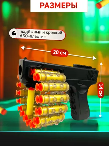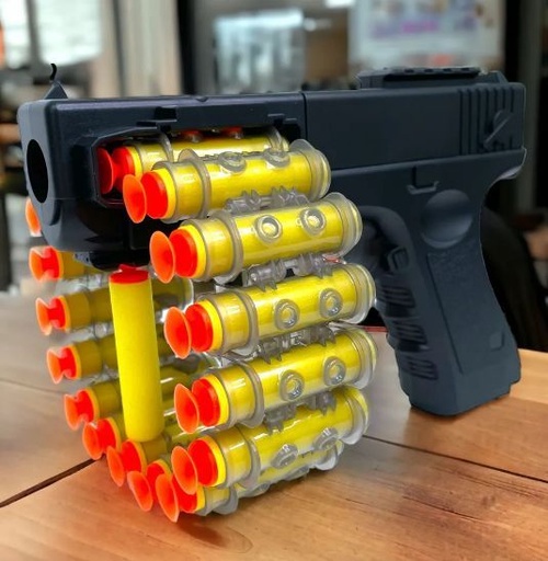 مسدس لعبة بتصميم مستوحى من مسدس "الجلوك" الكلاسيكي، مصنوع من بلاستيك (ABS) القوي والمتين ليتحمل اللعب المستمر. يتميز هذا السلاح بوجود حزام (خزنة) دائري دوار يتسع لعدد كبير من الطلقات الإسفنجية في وقت واحد. الطلقات مزودة برؤوس شفط لاصقة (Suction Cups) تلتصق بالأسطح الملساء. حجم المسدس (20 × 14 سم) مصمم خصيصاً ليكون مريحاً ومناسباً لقبضة الأطفال.