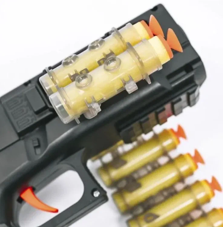 - طلقات إسفنجية لاصقة وآمنة: يستخدم طلقات فوم ناعمة جداً برؤوس شفط تلتصق بالزجاج والأسطح الملساء، وتضمن عدم إحداث أي ضرر بالأطفال أو أثاث المنزل.