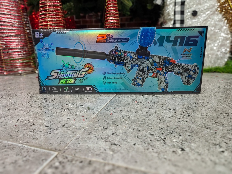رشاش M416 (Shooting Elite) هو لعبة تصويب متطورة مصممة بهيكل قوي مزين برسومات (Graffiti) عصرية لافتة للأنظار. يستخدم السلاح طلقات الأوربيز (كرات الجل المائية) التي تنفجر عند الاصطدام وتتبخر دون ترك أي أثر أو فوضى. يأتي الرشاش مع ملحقات قابلة للتركيب (DIY) ليتمكن الطفل من تخصيص سلاحه بالشكل الذي يفضله، ويعمل بنظام مزدوج وبطارية قابلة لإعادة الشحن تضمن وقت لعب طويل ومستمر.