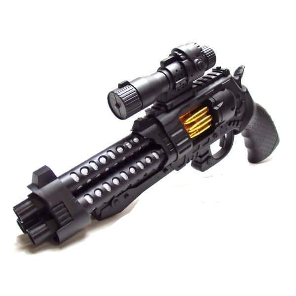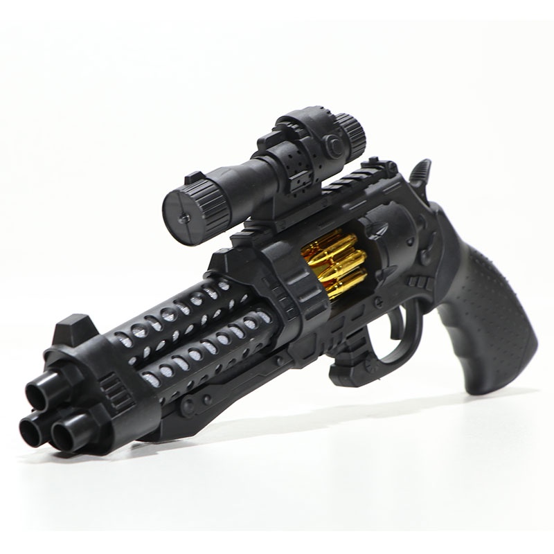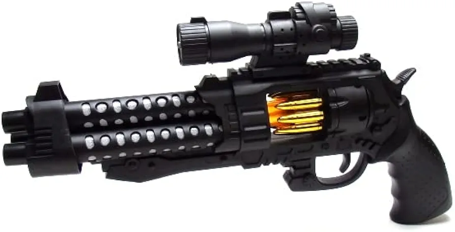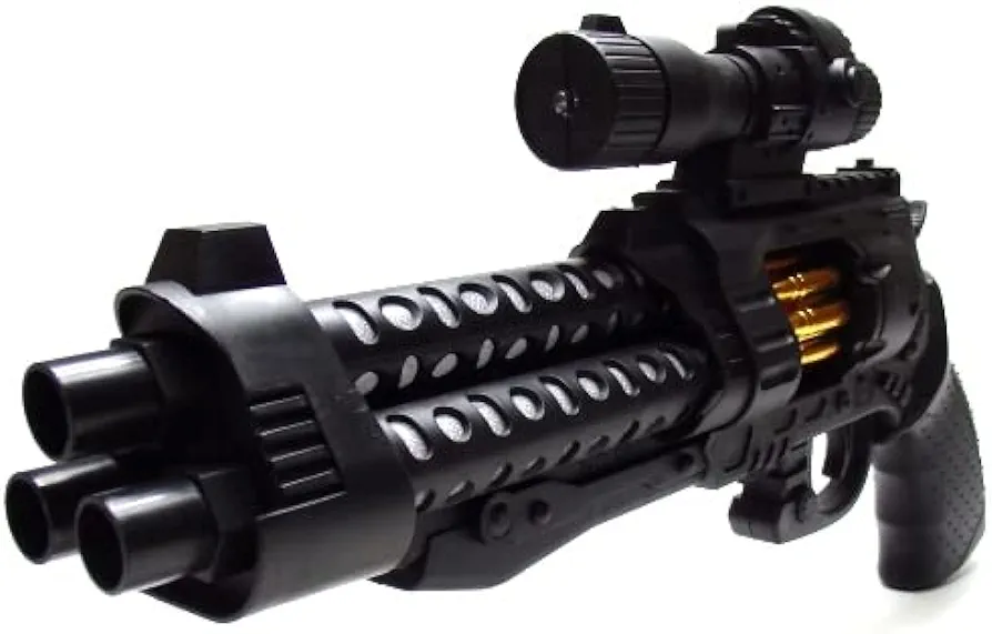 مسدس لعبة إلكتروني بتصميم هجومي جذاب يجمع بين شكل المسدس التكتيكي والرشاش ذي الفوهات المتعددة. يعمل بالبطاريات ليقدم تجربة لعب حيوية من خلال المؤثرات الصوتية التي تحاكي إطلاق النار، والإضاءة التفاعلية. يأتي السلاح مزوداً بمنظار علوي (Scope) وتفاصيل بارزة رائعة مثل أسطوانة الطلقات الذهبية الوهمية، وهو مصمم ليكون آمناً 100% حيث يعتمد على المؤثرات فقط ولا يطلق أي مقذوفات فعلية.
