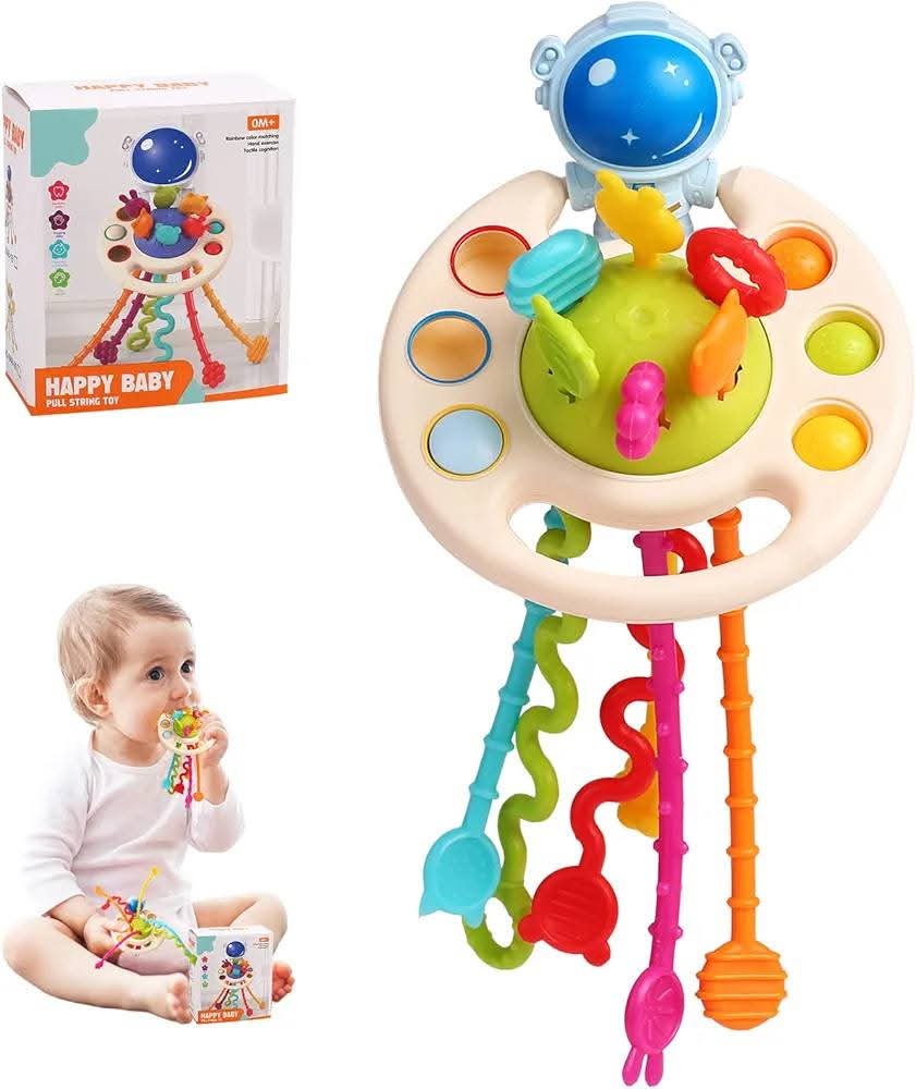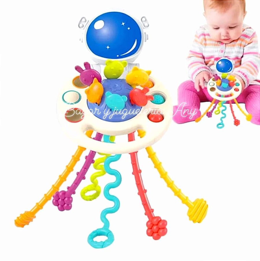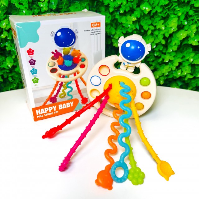 لعبة تفاعلية متعددة الحواس مخصصة للأطفال الرضع، تأتي بتصميم جذاب على شكل مركبة فضائية يعلوها مجسم رائد فضاء لطيف. تحتوي اللعبة على حبال سيليكون مرنة ذات ملامس متعرجة وأشكال مختلفة يمكن للطفل سحبها من جهة لأخرى، بالإضافة إلى أزرار ضغط جانبية (بوب إت) ناعمة. اللعبة مصنوعة من السيليكون الآمن غذائياً والمناسب لعض الطفل أثناء فترة التسنين، وتتميز بمقابض سهلة الإمساك للأيدي الصغيرة.